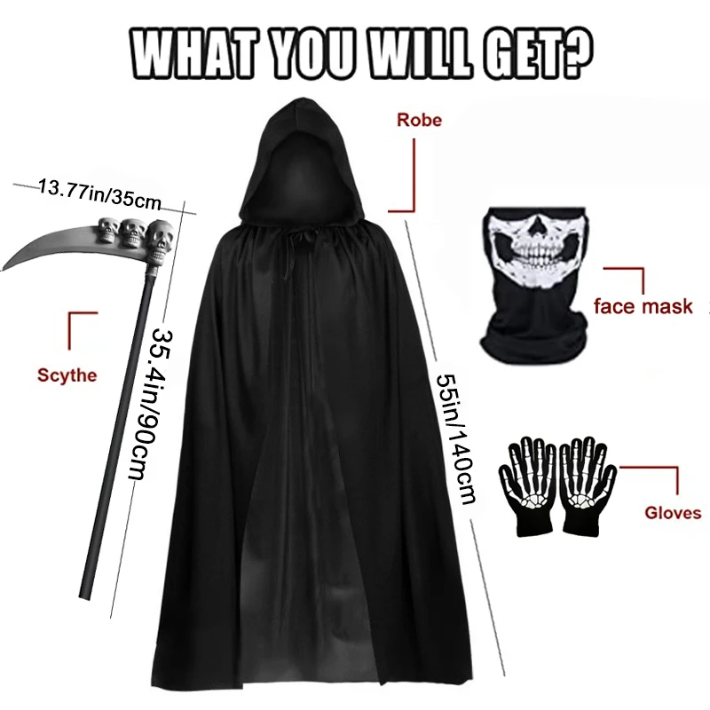 Skull Mask, Skeleton Gloves, Hooded Cloak Material: 100% Polyester (Tape)